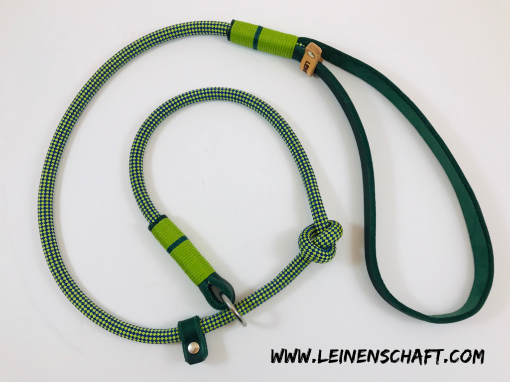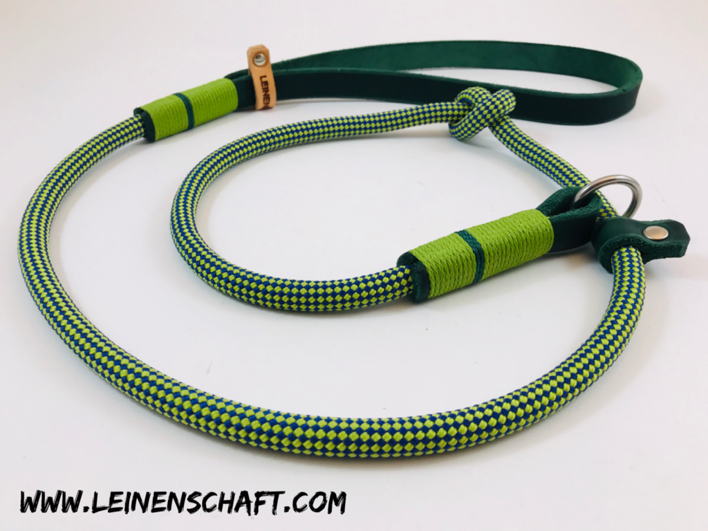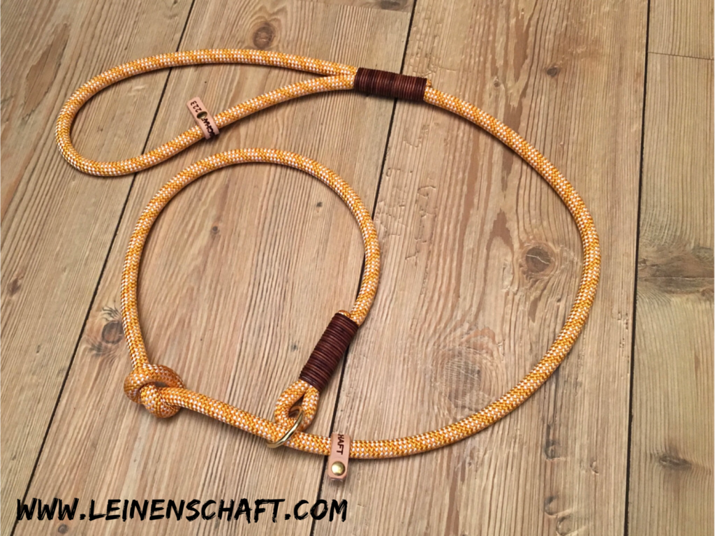 Retrieverleinen sind Leine und Halsband in einem. Einfache Retrieverleinen sind bei uns standardmäßig ca. 1m lang, zweifach verstellbare 2m / 1m. Es kann jedoch auf Wunsch jede beliebige Länge realisiert werden. Variable Retrieverleinen sind auf jeden Halsumfang einstellbar, wobei sie so eingestellt werden sollten, dass der Hund nicht gewürgt wird. Eine Lederlasche verhindert, dass sich die Schlinge beim Tragen zu sehr öffnet, und über den Kopf rutscht.